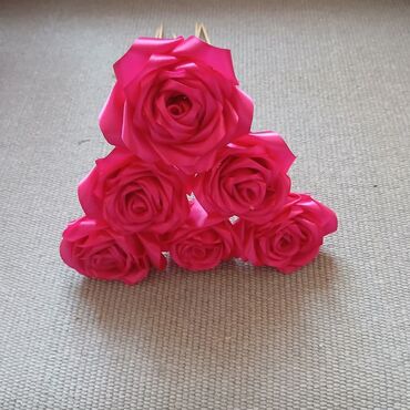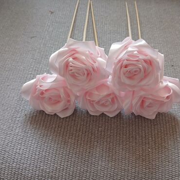 Ručne svilene ruže – dekorativni buketi - Materijal: sjajna atlas/saten traka u svetloružičastoj (latice) i zelenoj boji (lišće i stabljike). - Izrada: ručno modelirane latice i listovi, pažljivo ...
