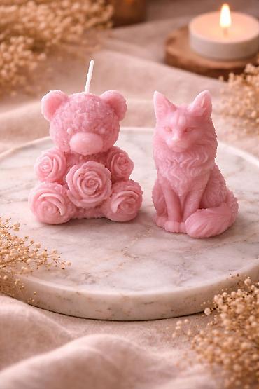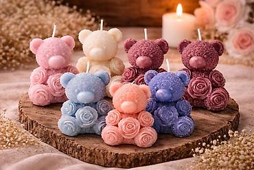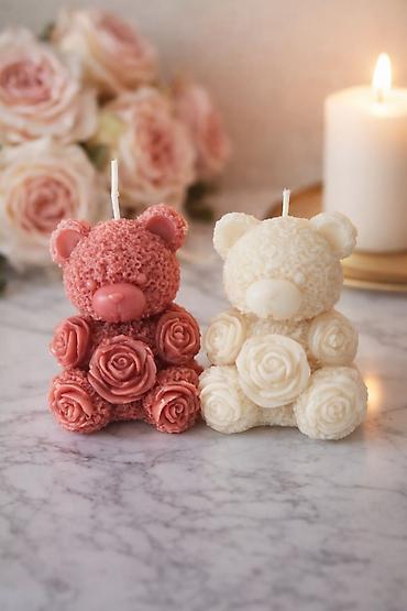 - Ručno izlivena sveća u obliku mede, ukrašena detaljnim reljefnim ružama na šapama i oko tela.