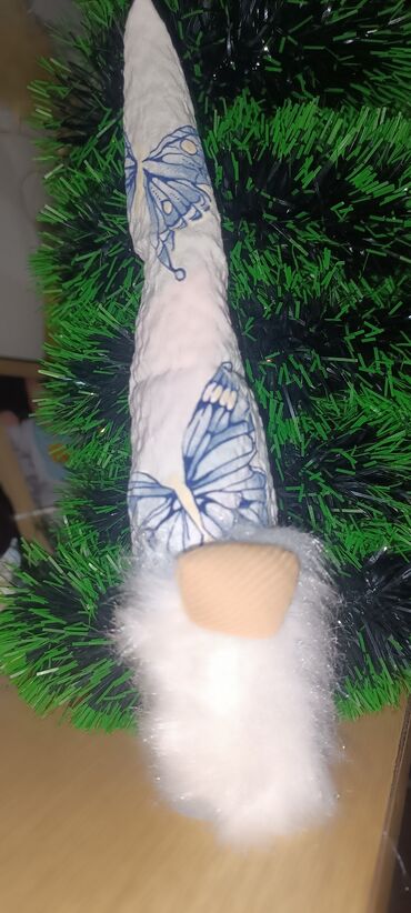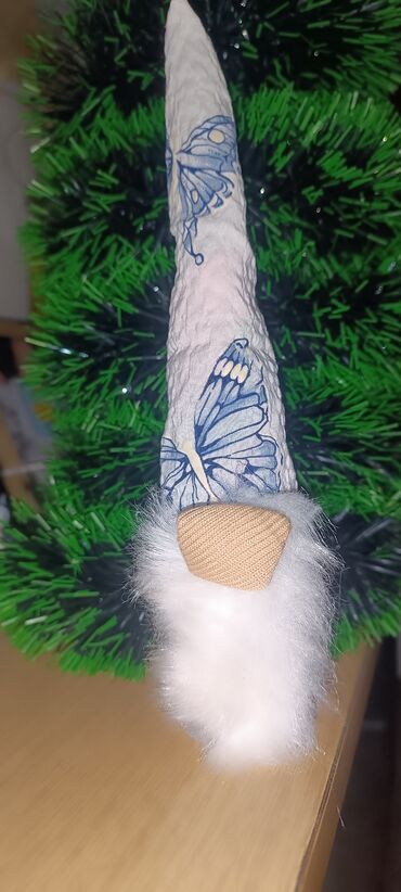 - Materijali: tekstilna kapa sa plavim motivima leptira, nežna veštačka brada od mekane bele „krznenaste“ tkanine, tekstilni nos u bež boji.