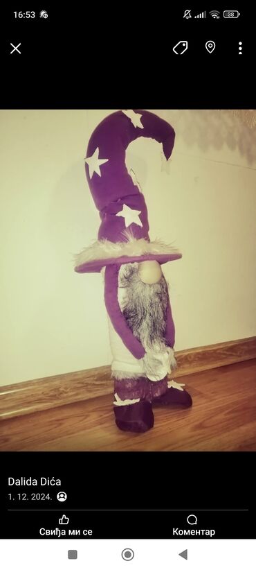 - Dimenzije procena: figura visoka oko 60–80 cm do vrha kape (zavisno od savijanja), širina baze približno 15–20 cm