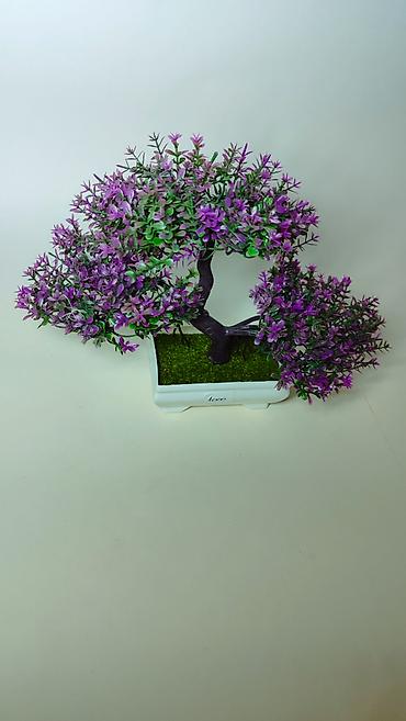 - Realistična bonsai kompozicija sa trodelnom krošnjom u nijansama zelene i ljubičaste