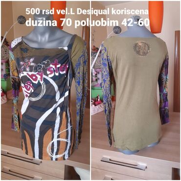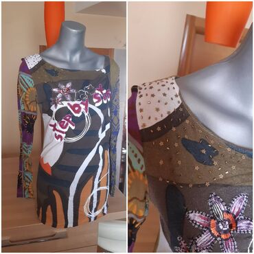 Desigual ženska majica dugih rukava, veličina L. Asimetričan izrez, prednji deo sa upečatljivim printom “step by step”, aplikacijama i sitnim ukrasnim nitnama/zvezdicama. Rukavi i prednji panel u višebojnom, patchwork stilu; leđa jednobojna maslinasto-zelena sa kružnim Desigual motivom pri vrhu. Mekan, rastegljiv materijal koji lepo prati figuru.