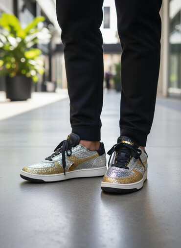 - Gornjište: tekstil sa punim sjajnim šljokičastim premazom; bočni Diadora znak u zlatnoj šljokici