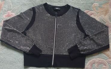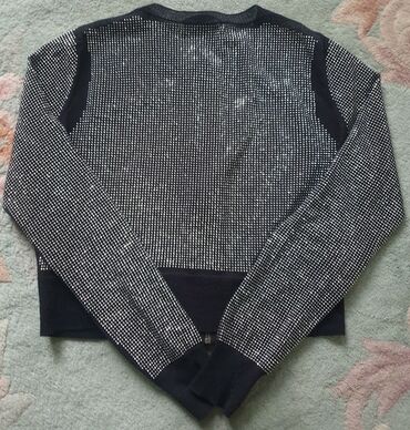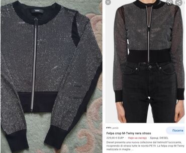 DIESEL original fazonski komad, jakna bolero, sa strasom svuda.. moze biti i za dnevnu varijantu. Model je M-twiny pa vidite na netu sastav, slike kako stoji i detalje. S velicina, nije nikad noseno. Cena u radnji 229e. Diesel cropped cardigan with all-over studs. Deo oko ramena koji nije pokriven štrasom, blago providan..