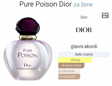DiorŽenski parfem "Pure Poison" brenda Dior, zapremine 100 ml. Ovaj Eau de Parfum dolazi u elegantnoj staklenoj bočici sa tamnim, sferičnim čepom, odražavajući prefinjenost i luksuz. Dizajniran je za žene koje preferiraju sofisticirane i dugotrajne mirise. Idealan je za večernje izlaske i posebne prilike, pružajući osećaj misterije i privlačnosti. Miris je složen, sa glavnim akordima belog cveća, citrusa i drvenih nota, obogaćen puderastim i životinjskim tonovima. Pakovanje je u tamnoljubičastoj boji sa metalik sjajem, što dodatno ističe ekskluzivnost proizvoda.
