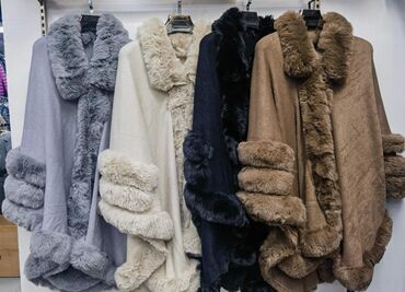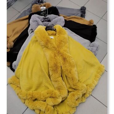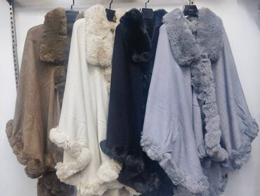 Ženski ogrtač/pončo sa krznom + set parfema - Elegantni sivi pončo sa bogatim krznenim okovratnikom i krznenim resicama na vezici. Širok kroj, lako se oblači preko garderobe, idealan za hladnije d...