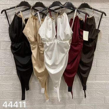 Ženski bodi sa tankim bretelama i kaskadnim (drapiranim) dekolteom. - Model: pripijeni kroj, duboki „cowl neck“ izrez, elastični materijal. - Zakopčavanje: kopča između nogu (praktично oblačenje i...