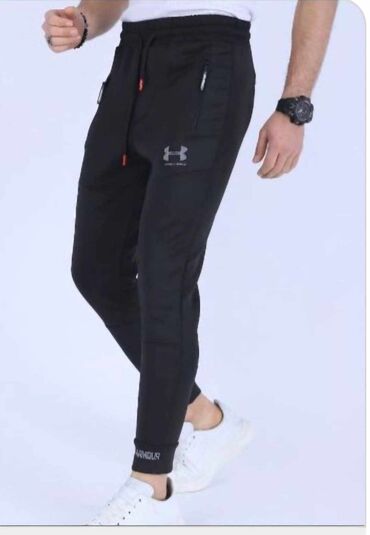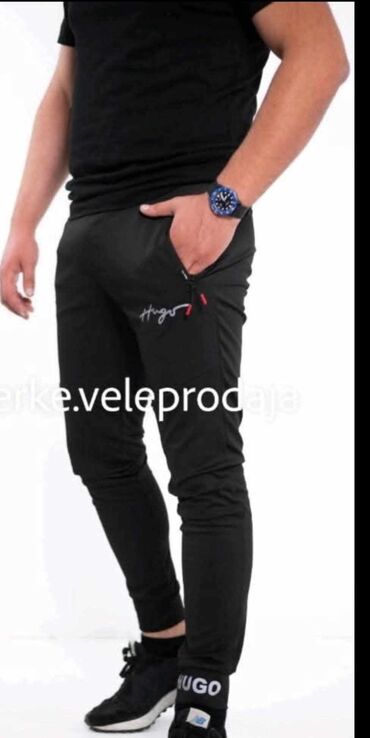 Muške Adidas trenerke – crne, sa prepoznatljive tri bele pruge duž nogavica i Adidas logotipom na butini. Ravnog, komotnog kroja sa elastičnim pojasom i učkurom za podešavanje. Dva bočna džepa za p...