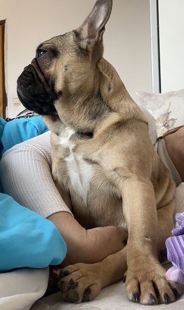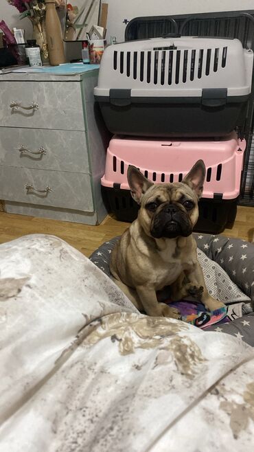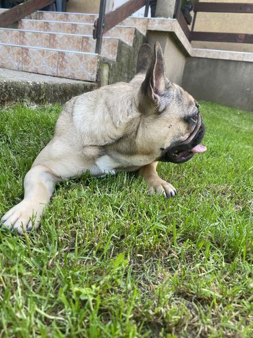 Francuski buldog – mužjak - Rasa: francuski buldog - Pol: mužjak - Dlaka: kratka, tigrasta/fawn nijansa sa tamnijom maskom - Uši: uspravne, tipične “šišmiš” uši - Njuška: kratka, široka, izražene ...