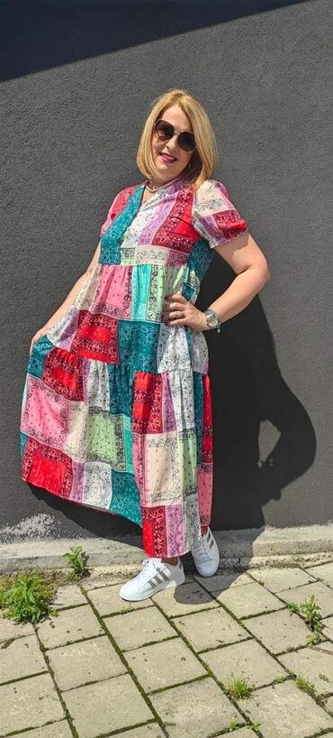 Ženska haljina/kaput-haljina sa printom Velicina 50 - Kroj: A-linija, dužina do ispod kolena; kratki rukavi. - Kopčanje: prednje kopčanje na dugmad. - Kragna: klasična, sa reverima. - Materijal: gl...