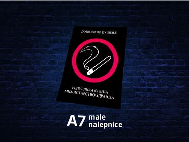 Dozvoljeno pušenje male,mini nalepnice,dimenzija 68x97 mm,(nešto manje od A7 formata).Nalepnice namenjene pre svega ugostiteljskim objektima za označavanje zone u kojoj je dozvoljeno pušenje.U skladu sa tim,nalenpnice su namenjene unutrašnjoj upotrebi,odštampane su na specijalnom samolepljivom papiru.U ponudi je komplet od 8 ovakvih nalepnica.Sve dodatne informacije Lalafo poruke ili telefonom.Pogledajte sve naše oglase na Lalafo.Imamo u ponudi i nalepnice zabranjeno pušenje.Bavimo se grafičkim dizajnom i digitalnom štampom kao i izradom različitih vizulenih rešenja kako štampanih tako i digitalnih.Pratite nas na društvenim mrežama. #myofficepca