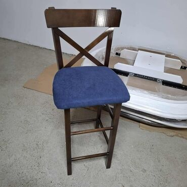Drvena barska stolica sa naslonom u stilu “X”.