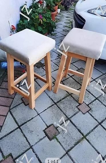 Barske stolice od punog drveta (verovatno bukva), sa tapaciranim sedištem.