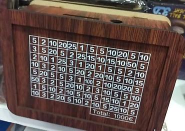 - Pametna kasica sa tabelom uštede na frontu: svako polje ima iznos (1, 2, 3, 5, 10, 15, 20, 25, 50, 100), a zbir svih polja je 1000 €.