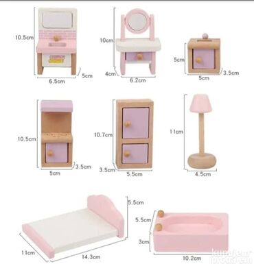 - Materijal: drvo, obojeno u pastelne tonove (ružičasta, ljubičasta, prirodno drvo)