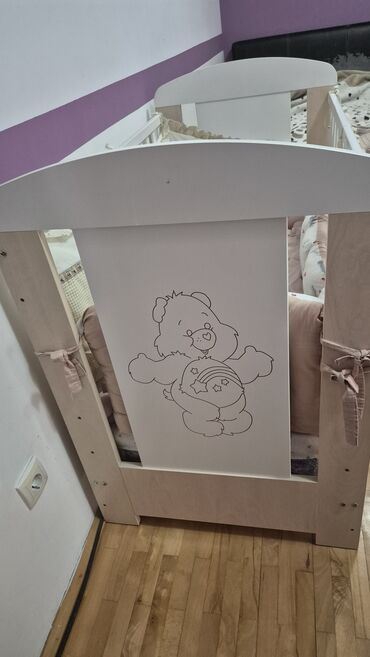 Drveni krevetac za bebe sa motivom mede na obema čelnim stranicama.
