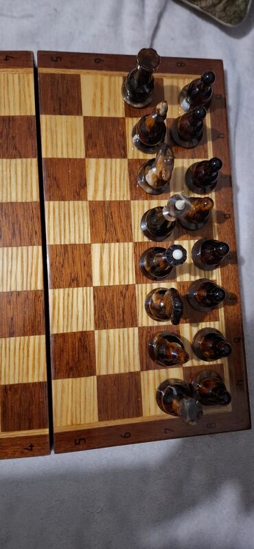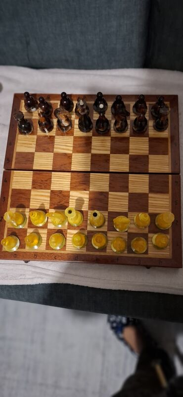 Šah set – drvena preklopna tabla sa figurama i originalnom kutijom, ruska, sa figurama kao od cilibara.