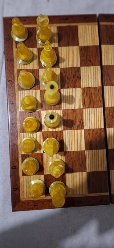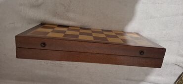 - Tabla: drvena, sklopiva, sa urezanim koordinatama (a–h, 1–8). Unutrašnjost čini polje 8x8 od svetlijih i tamnijih drvenih kvadrata; ram je tamniji, sa metalnim kopčama/šarkama sa strane.