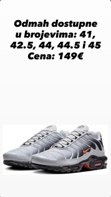 - Nike Air Max patike u sivo-crnoj kombinaciji sa narandžastim Swoosh detaljima. Mrežasto gornjište sa ojačanjima, jastučasti đon sa vidljivim Air jedinicama, gumeni potplat za dobro prianjanje. Odmah dostupne brojevi: 41, 42.5, 44, 44.5 i 45. Cena: 149€.