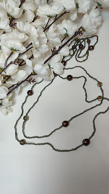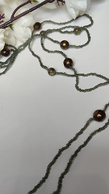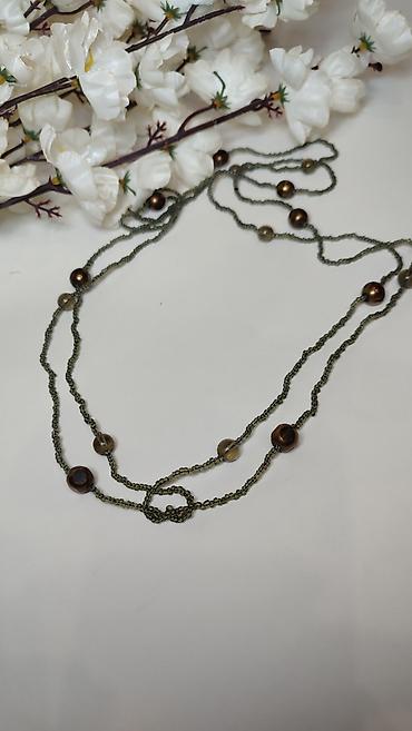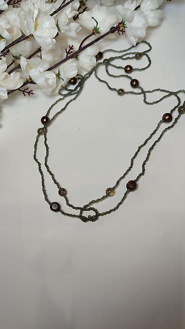 - Dizajn: dvostruki/višeslojni niz sitnih perlica u maslinasto‑zelenoj boji