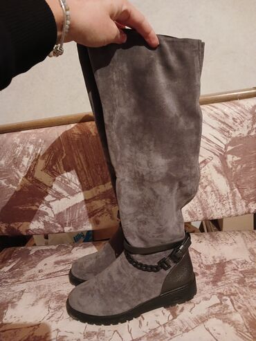 Ženske zimske čizme – klasičan model - Boja: tamno siva/antracit - Visina do iznad članka (mid-calf) - Gornjište od mekog, baršunastog materijala (na izgled nalik brušene kože/veluru) - Deblji top...