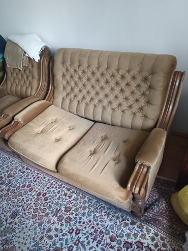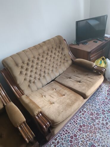 - Tapacirung: mekana štof/velur tkanina u svetlo‑braon (kamel) boji, dekorativno proštepana sa dubokim dugmićima na naslonu.