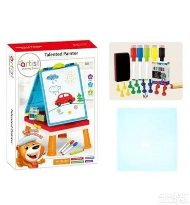 Komplet sadrži razne dodatke za malog umetnika: bojice, markerima, sunđer, kocke i društvenu igru.