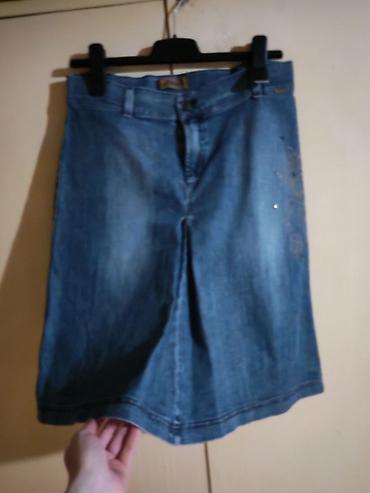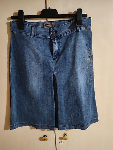 Ženska teksas suknja – tamno plava (indigo), klasičnog kroja do kolena. Detalji: - Brend: BROS (etiketa na pojasu) - Model: uska (pencil) silueta - Materijal: klasičan džins sa blagim ispranim efe...