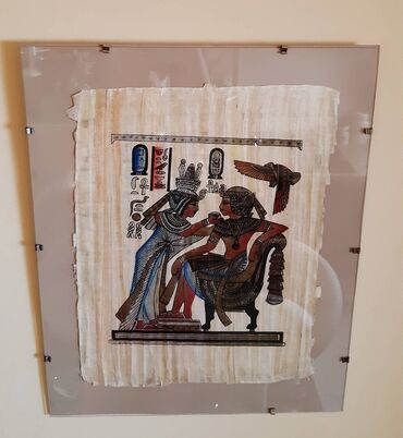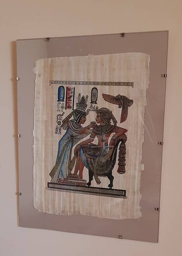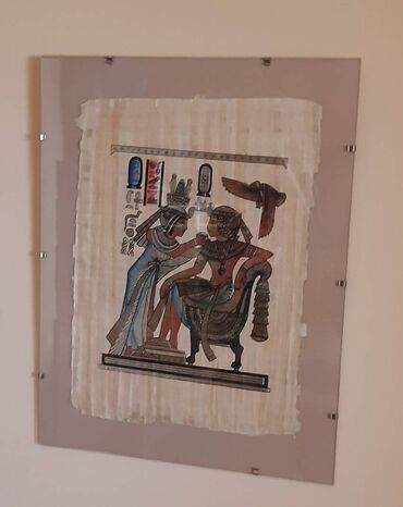 Egipatski papirus – zidna slika u ramu - Ručno oslikan motiv drevnog Egipta (figuralna scena sa hijeroglifima), na pravom papirusu sa vidljivom teksturom vlakana. - Montirano između dva stakla/ple...