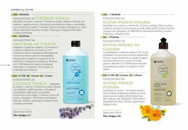 - Koncentrat za čišćenje stakla (šifra: 211): razređuje se s vodom 1:3 za lako i efikasno čišćenje svih staklenih i glatkih površina. Antistatičko dejstvo štiti TV ekrane i police od prašine. Obogaćen 100% biljnim ekstraktom lavande i bosiljka. Blag, prijatan miris osvežava prostorije.