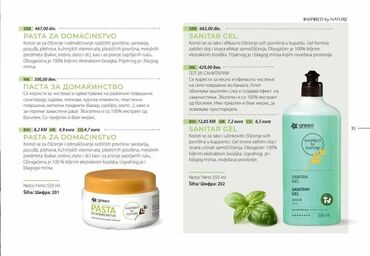 - Pasta za domaćinstvo (šifra: 201): čišćenje i odmašćivanje sanitarija, posuđa, plehova, kuhinjskih elemenata, plastičnih i metalnih površina (bakar, srebro, zlato i dr.), kao i pranje zaprljanih ruku. Obogaćena 100% biljnim ekstraktom bosiljka. Ugodnog, blagoga mirisa.