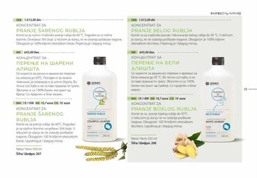 - Koncentrat za pranje šarenog rublja (šifra: 207): za ručno i mašinsko pranje do 60°C, pogodan za nežne tkanine, osvežava i štiti boje, u tečnom stanju ne ostavlja praškaste tragove. Obogaćen 100% biljnim ekstraktom breze. Prijatan, blag miris.