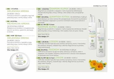 - Koncentrat za ručno pranje posuđa (šifra: 205): razređuje se s vodom do 1:8 i daje 5 litara kvalitetnog sredstva za ručno pranje posuđa. Sadrži zaštitni balzam koji štiti i neguje ruke. Obogaćen 100% biljnim ekstraktom kamilice i nene. Prijatan, blag miris.