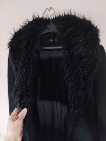 Ženski crveni kaput sa crnim krznenim ovratnikom/šalom. - Model: elegantan, ravnog kroja, dužina do kolena - Boja: intenzivno crvena - Detalji: veliki crni krzneni dodatak preko ramena i grudi (mo...