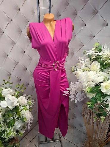 Haljina pruža ženstvenu siluetu zahvaljujući strateškim naborima oko struka i preklopu koji produžava figuru, dok luksuzni sjaj materijala daje elegantan završetak.