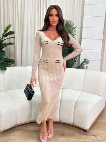 Elegantna ženska pletena midi haljina sa dugim rukavima - Uska
