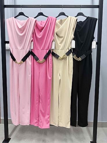 💫💫Elegantni ženski kombinezon bez rukava sa drapiranim (vodopad) izrezom i ravnim nogavicama. Model naglašava struk elastičnim pojasom u crnoj boji sa dekorativnim lančanim detaljem u zlatoj nijansi. Diskretan rajsferšlus pozadi olakšava oblačenje. Bočni džepovi dodaju praktičnost, a čist, sofisticiran kroj pogodan je za svečane i poslovne prilike.