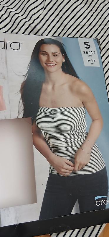 - Crna ženska majica/top bez rukava sa ukrštenim tankim bretelama napred i malim ukrasnim prstenom na dekolteu. Elastična, pripijena, dužine preko kukova. Univerzalna veličina. U oglasu navedeno: 3...