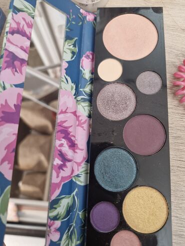 - Kompaktna paleta u kartonskom pakovanju sa floralnim dizajnom i ugrađenim ogledalom.