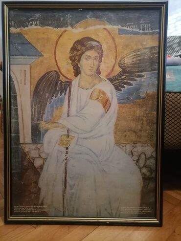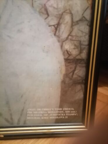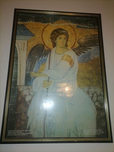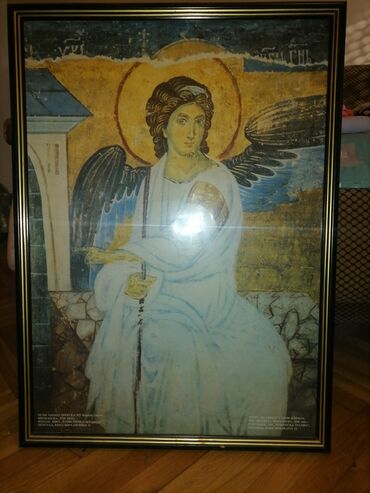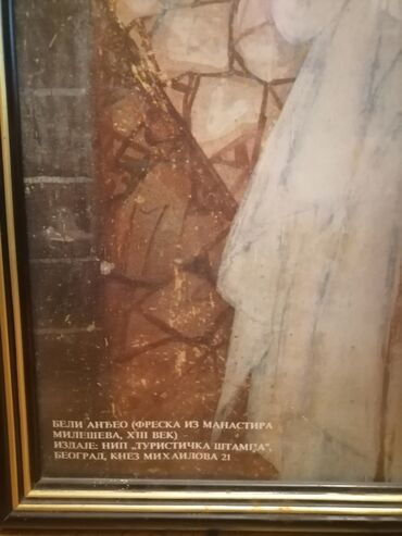 Uramljeni poster/fotoreprodukcija freske “Beli anđeo” iz manastira Mileševa (XIII vek). - Motiv: anđeo na Hristovom grobu, čuvena srednjovekovna srpska freska - Natpisi na dnu postera: srpski i en...