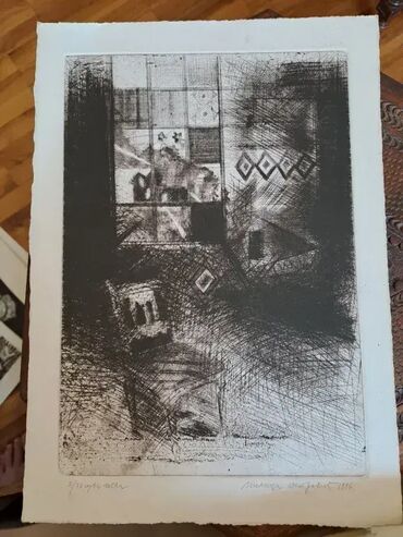Grafika Svetlane Ribice iz 1986g pod nazivom "stuka". Uramljena, zastakljena. Ukupna dimenzija 52x62cm