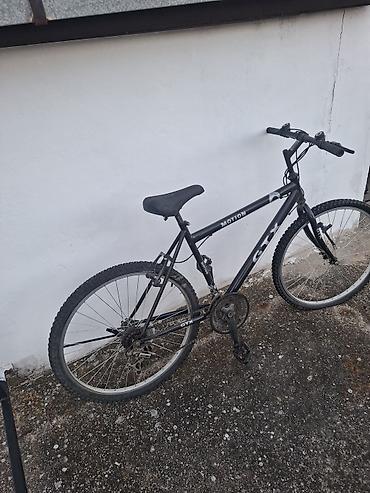 Praktičan gradsko/terenac bicikl sa 26" točkovima, višebrzinskim prenosom i V-brake kočenjem, pogodan za vožnju po gradu, makadamu i rekreativne ture. Crna boja, GTX Motion oznake na ramu i viljušci.