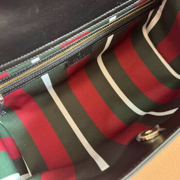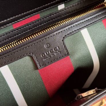 - Unutrašnjost: podstava sa karakterističnim zeleno-crvenim prugama; unutrašnji džep sa rajsferšlusom i kožnom GUCCI Made in Italy pločicom