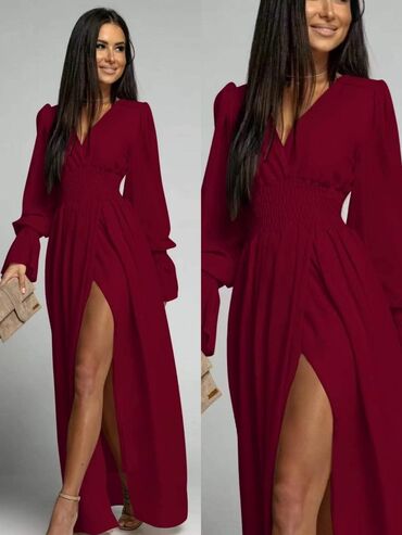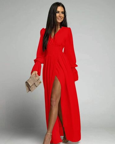 Svečana duga haljina u crvenoj boji sa korpičastim gornjim delom i visokim šlicem na nozi. vel S/M za ozbiljne kupce saljem snimak