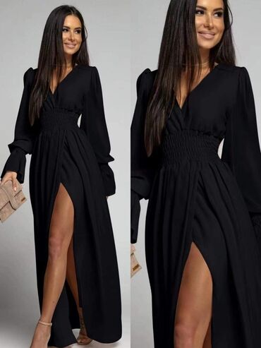 Elegantna večernja haljina – crna, duga, sa dramatičnim šlepom i visokim šlicem. - Kroj: sirena/suknja sa naborima napred, visoki otvor na butini, produženi asimetrični šlep sa strane. - Gornji de...