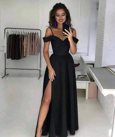 Elegantna večernja haljina – crna, duga, sa dramatičnim šlepom i visokim šlicem. - Kroj: sirena/suknja sa naborima napred, visoki otvor na butini, produženi asimetrični šlep sa strane. - Gornji de...