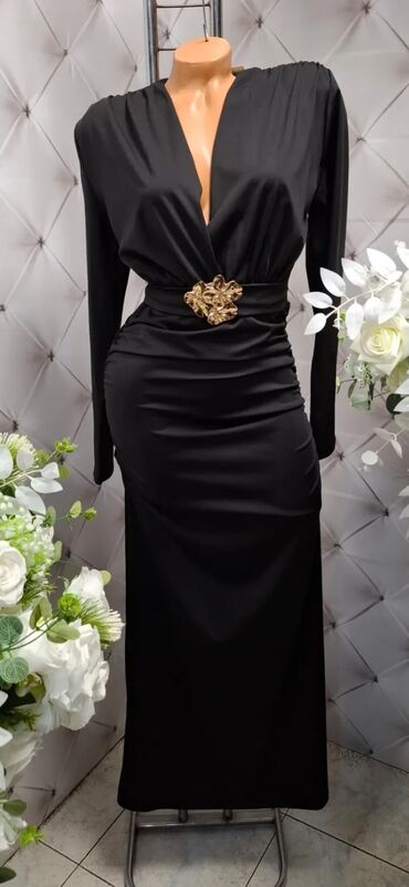 Elegantna crna midi/duga haljina - Kroj: uska silueta koja prati liniju tela, dužina do članaka - Izrez: široki bardot/čamac izrez koji otkriva ramena sa preklop ivicom - Rukavi: dugi - Materijal:...