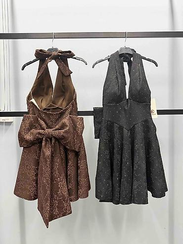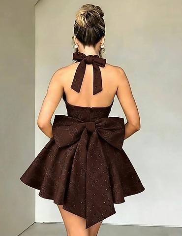 Kratka svečana haljina A-kroja sa dubokim V izrezom i vezivanjem oko vrata (halter). Prelepo strukirana, sa punim kružnim mini šor-faltnim donjim delom koji daje volumen i eleganciju pri kretanju. Na leđima efektna velika mašna koja se može podešavati, a tkanina je nežno reljefna sa diskretnim sjajnim tačkicama i floralnim dezenom.