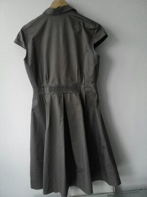Elegantna ženska haljina – krem/bela, kroj olovka (bodycon), dužina do kolena. Kratki rukavi sa metalnim dugmadima na ramenima, okrugli izrez. Sa prednje strane dva vertikalna štampana motiva inspi...