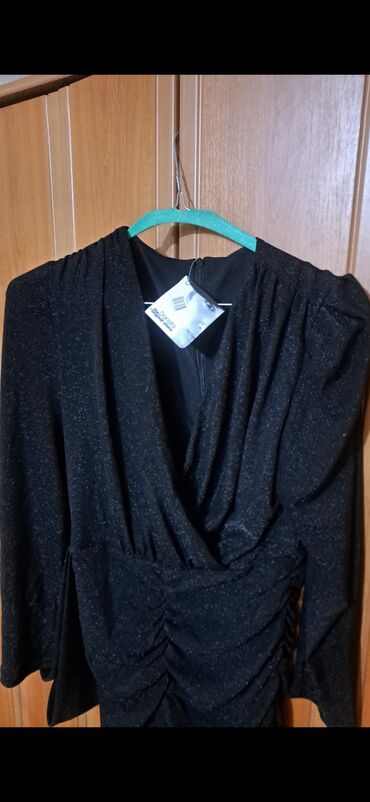 Haljina crna, NOVA iz Italije, vrlo elegantna, svecana, poliester - likra na V izraz, sa dugim rukavima, prati liniju tela, pozadi na rajfeslus, donji deo haljine napred i pozadi je nabran! Haljina je duzine od 95-100cm, postavljena celom duzinom, sto joj daje punocu! Vrlo veliki % likre, daje joj izuzetnu rastegljivost, br. L/XL. Vrlo skupoceno placena.